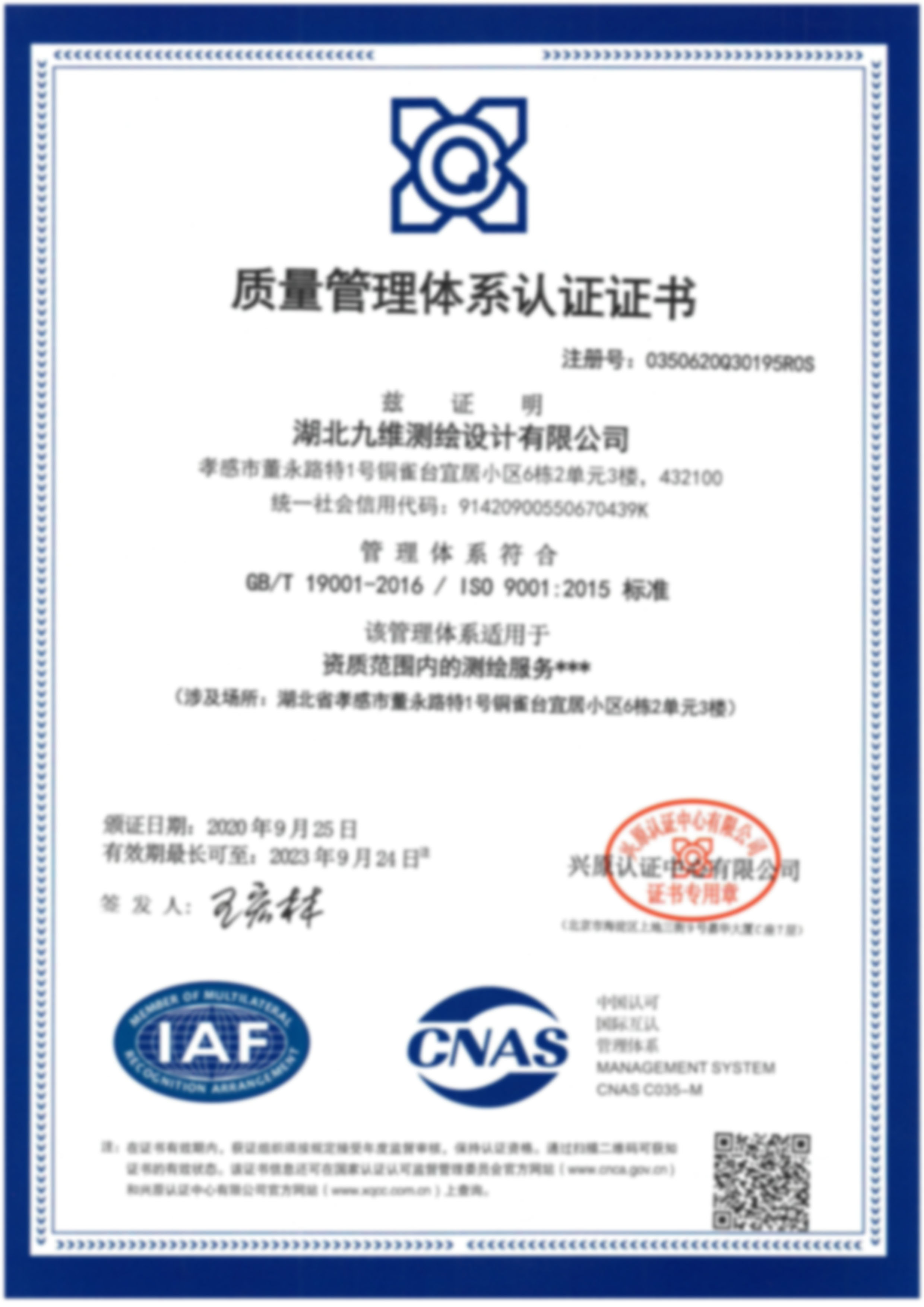 質(zhì)量管理體系認證證書